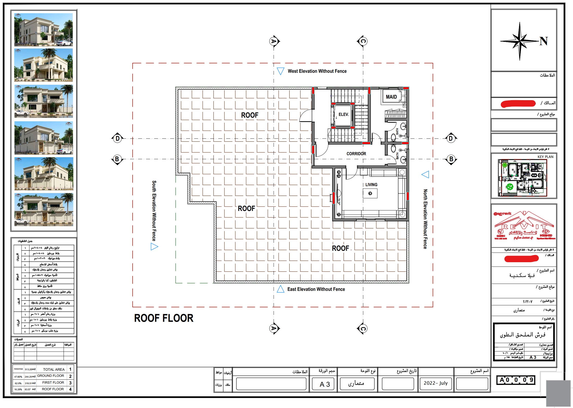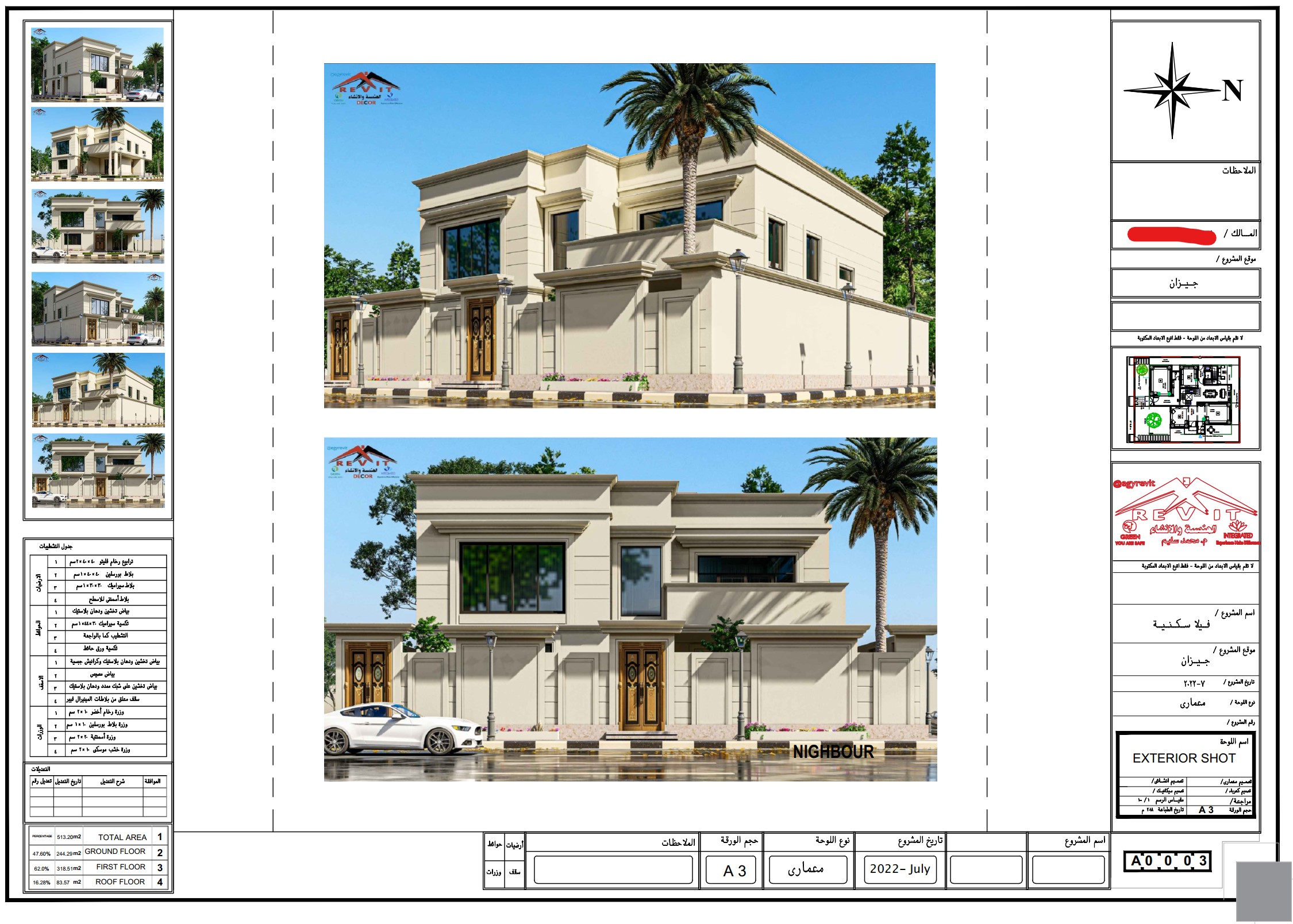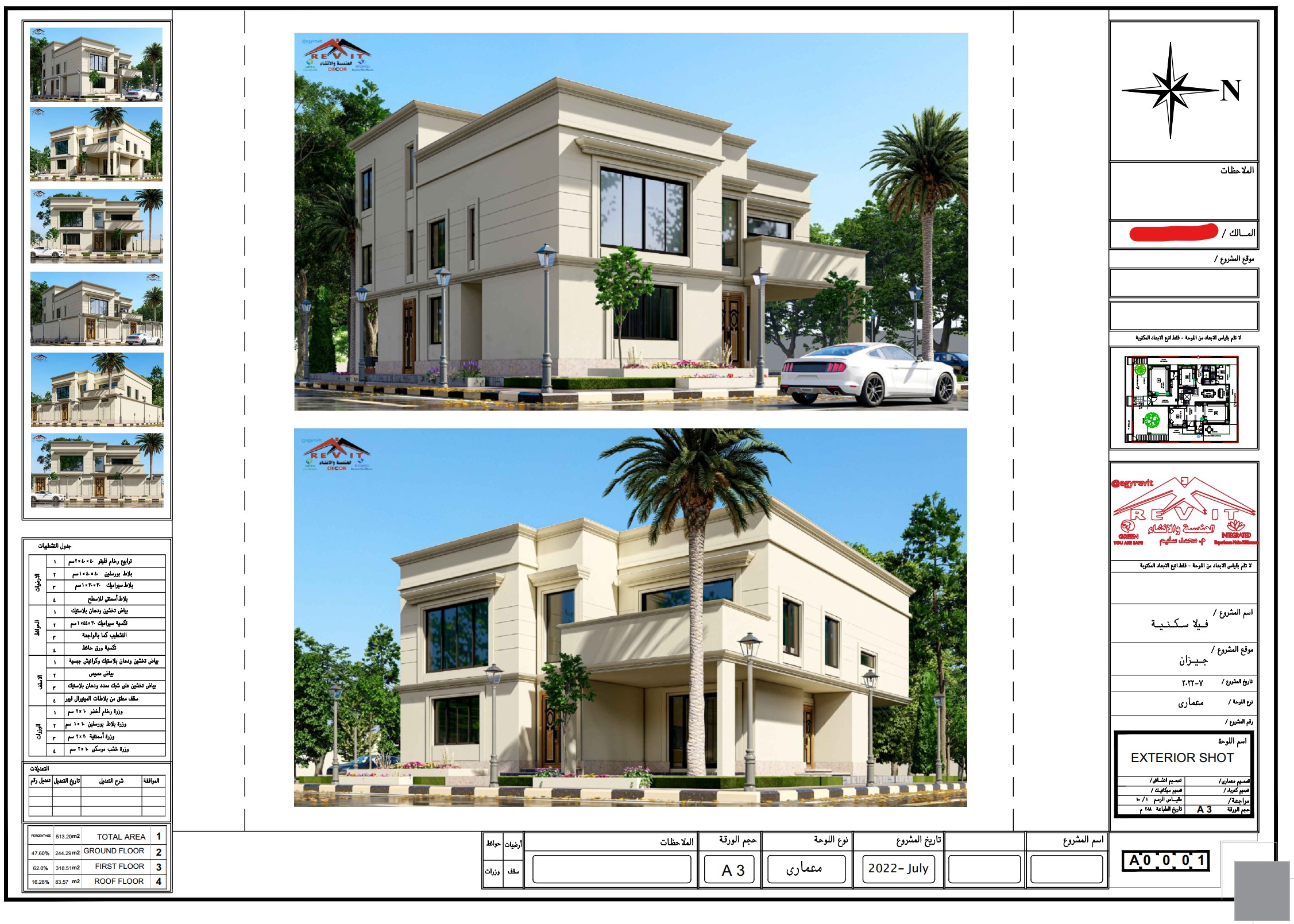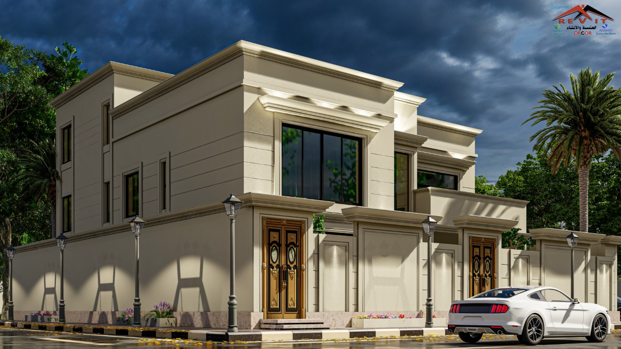 تصميم فيلا على الطراز الكلاسيكي المميز والدائم تصميم لجميع العصور .. التصميم يأتي على أرض مساحتها 513 متر مسطح (20.43 في 25.12 متر) ... وهو تصميم مميز جدا تم توزيع الفراغات بشكل احترافي .. استغلال احترافي للمساحات لتلبية احتياجات المالك رغم قلة مساحة الأرض.. و كافة المخططات احترافية، يتكون الدور الأرضي من مجلس رجال و استقبال و مجلس نساء و صالة عائلية عبارة عن طعام و مطبخ مفتوح عليه و صالة عائلية مع جميع الخدمات للمجالس والصالات ويوجد مصعد وجلسة خارجية و مساحات خضراء مميزه في الحوش أما الدور الأول علوي فيتكون من المطبخ الرئيسي المفتوح في الصالة وبينهما الطعام و غرفتين نوم مع حمام خاص لكل منهما مع غرفة الغسيل تتوسطهم بالاضافة الى غرفة النوم الرئيسية التي تأتي مع حمام واسع و غرفة ملابس مميزه و مدخل مميز مع ركن قهوه بالاضافة الى تراس باطلالة على الحديقة السفلية والدور الملحق به غرفة معيشة كبيرة مع دورة مياه و غرفة الخادمة مع خدماتها.